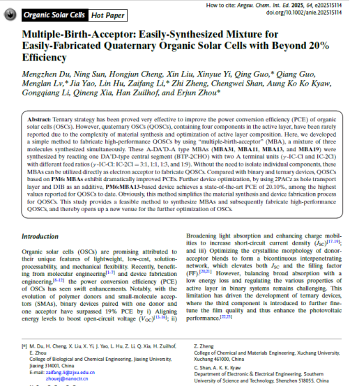 周二军团队在有机太阳能电池方向取得重要研究进展。相关研究成果以“Multiple-Birth-Acceptor : Easily-Synthesized Mixture for Easily-Fabricated Quaternary Organic Solar Cells with Beyond 20% Efficiency”为题,在化学类顶级期刊《Angew. Chem. Int. Ed.》上发表。这是我校首次以第一单位在该顶级期刊发表论文,第一作者为娱乐城