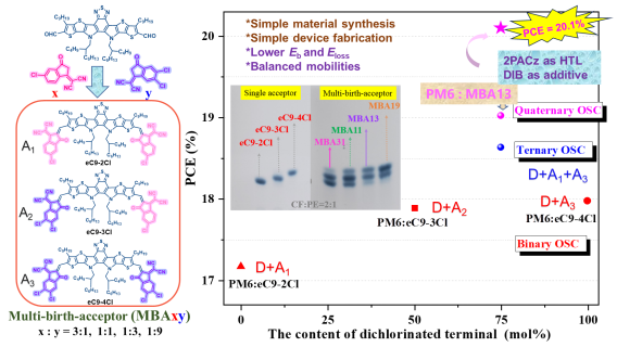 有机太阳能电池(Organic solar cells,OSCs)活性层中包括电子给体和电子受体,二元器件中两种材料的调控局限性导致很难实现高效的光电转换过程。三元策略是指活性层中引入第三组分,已经被证实是一种有效调控活性层性质并提升能量转换效率(Power conversion efficiency,PCE)的方法。然而,进一步拓展到四元策略时,由于四元活性层组分优化及材料合成的复杂性,导致四元OSC(Quaternary OSCs, QOSCs)的研究相对较少。 针对该问题,我们提出一种简单制备高性能QOSCs的方法。该方法的核心是采用一种二醛单体和两种氰基茚酮端基反应,同时合成出三种分子的混合物,我们称之为“多胞胎受体”(Multiple-Birth-Acceptor: MBA),如图2所示。虽然三种受体比移值极为接近导致分离困难,但该方法的巧妙之处在于这些MBA不用单独分离,即可直接作为电子受体用于QOSCs的制备。通过优化单氯端基和双氯端基的比例(3:1, 1:1, 1:3, 1:9),我们合成了四种“多胞胎受体”(MBA31,MBA11, MBA13,MBA19)并制备了四元器件。与二元和三元器件相比,四元器件表现出明显提升的PCE。其中,采用2PACz作为空穴传输层、DIB作为添加剂,基于PM6:MBA13活性层器件实现了20.10% 的PCE,是目前已报道QOSCs的最高值之一。以上内容概括图如图2所示。